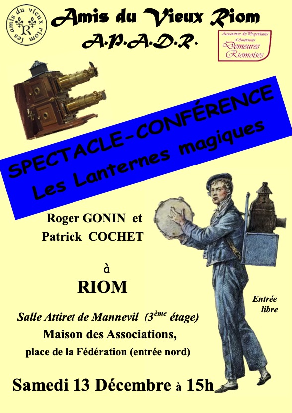 ProjectionsSpectacle de lanterne magique par Roger Gonin avec une lanterne double et des vues peintes à la main du dernier quart du XIXe siècle, suivi d’une rapide conférence sur l’histoire de la lanterne magique.